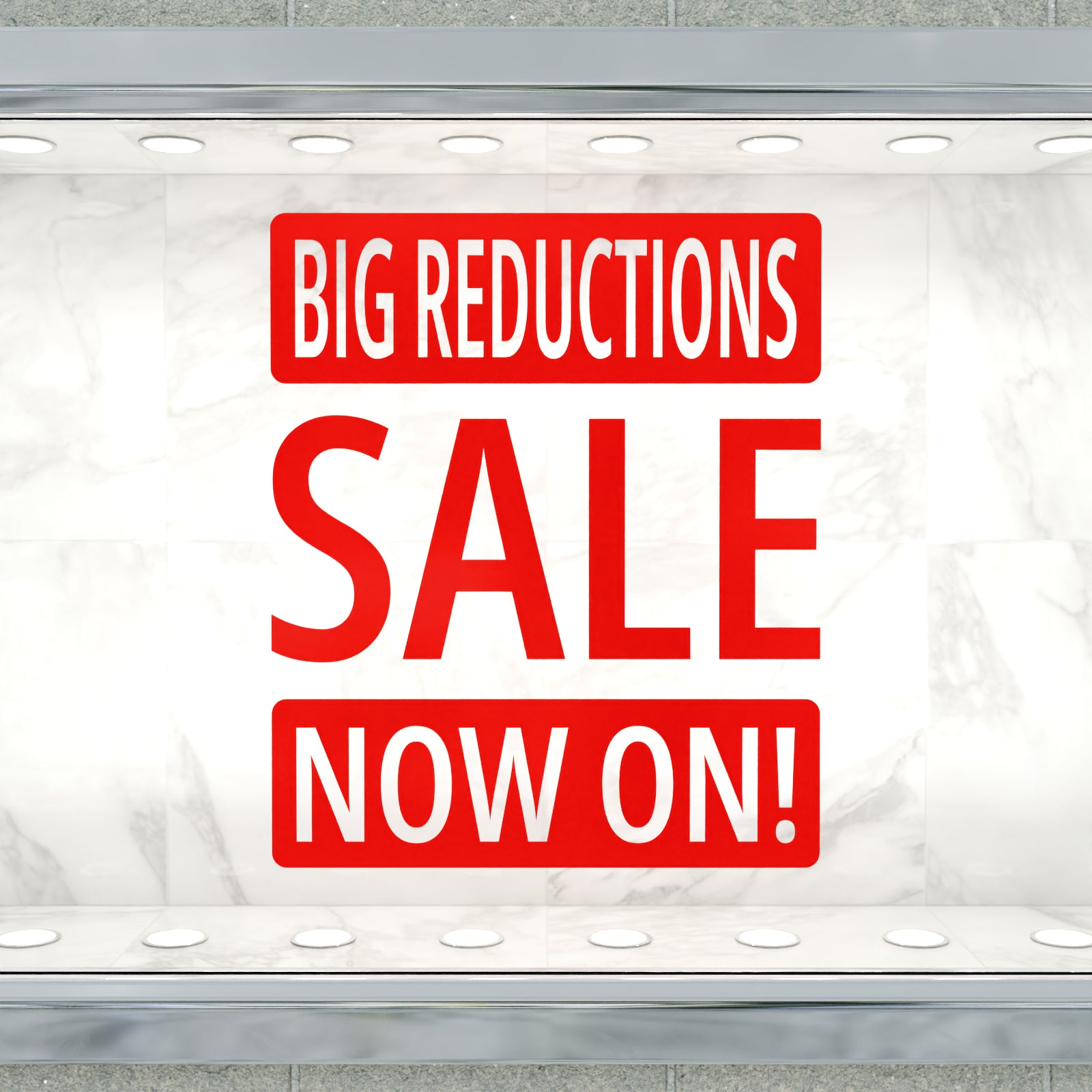 Promote your sale with this eye-catching 'Big Reductions Sale Now On!' window or wall sticker.