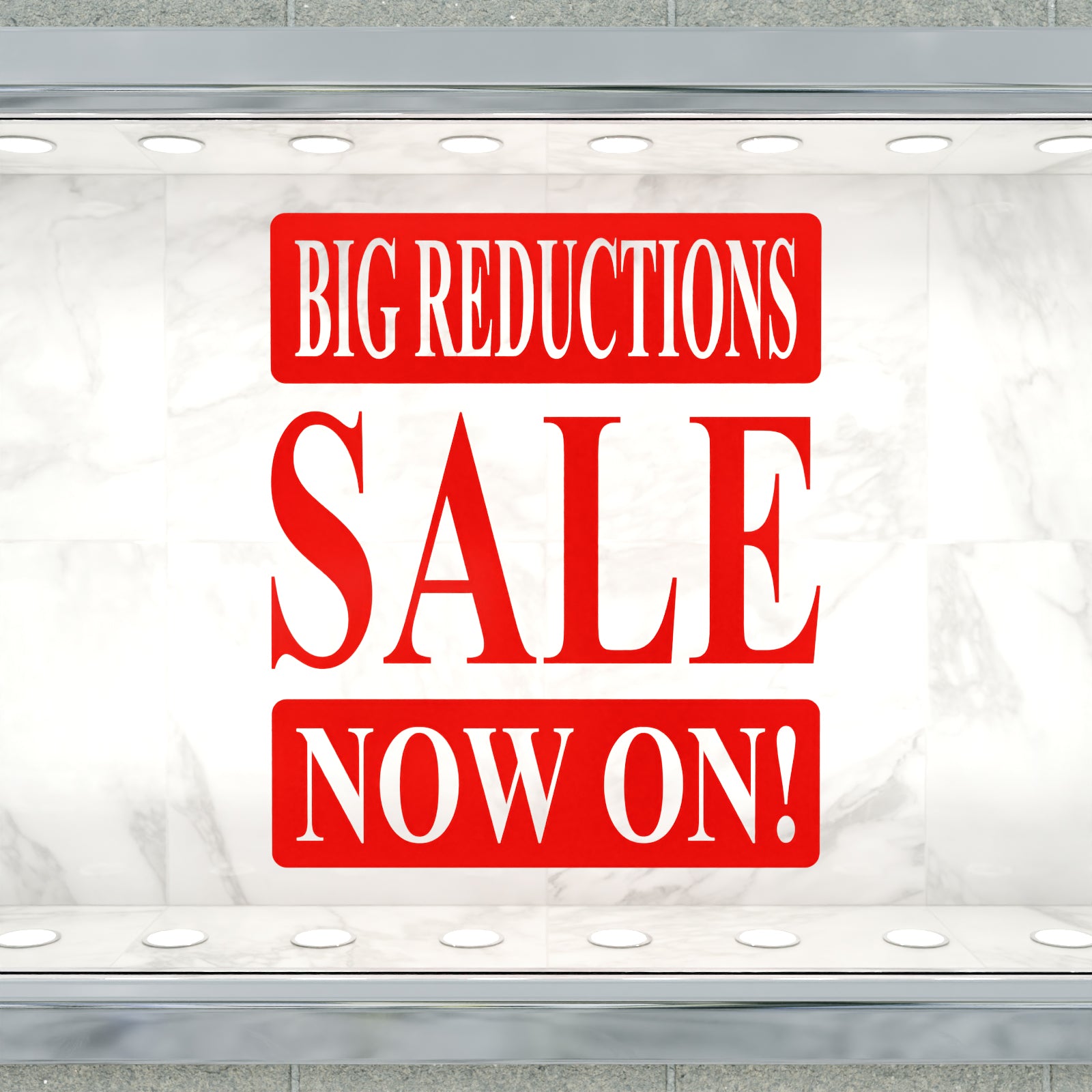 Promote your sale with this eye-catching 'Big Reductions Sale Now On!' window or wall sticker.