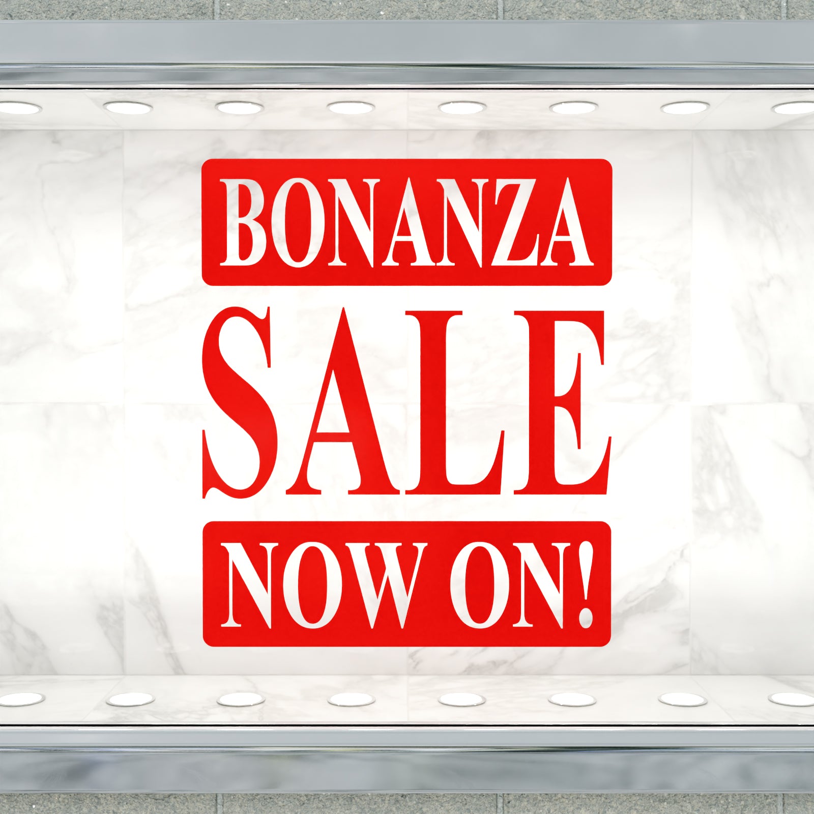 Promote your sale with this eye-catching 'Bonanza Sale Now On!' window or wall sticker.