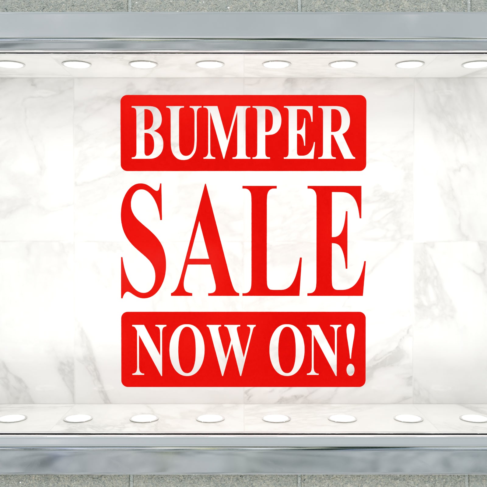 Promote your sale with this eye-catching 'Bumper Sale Now On!' window or wall sticker.