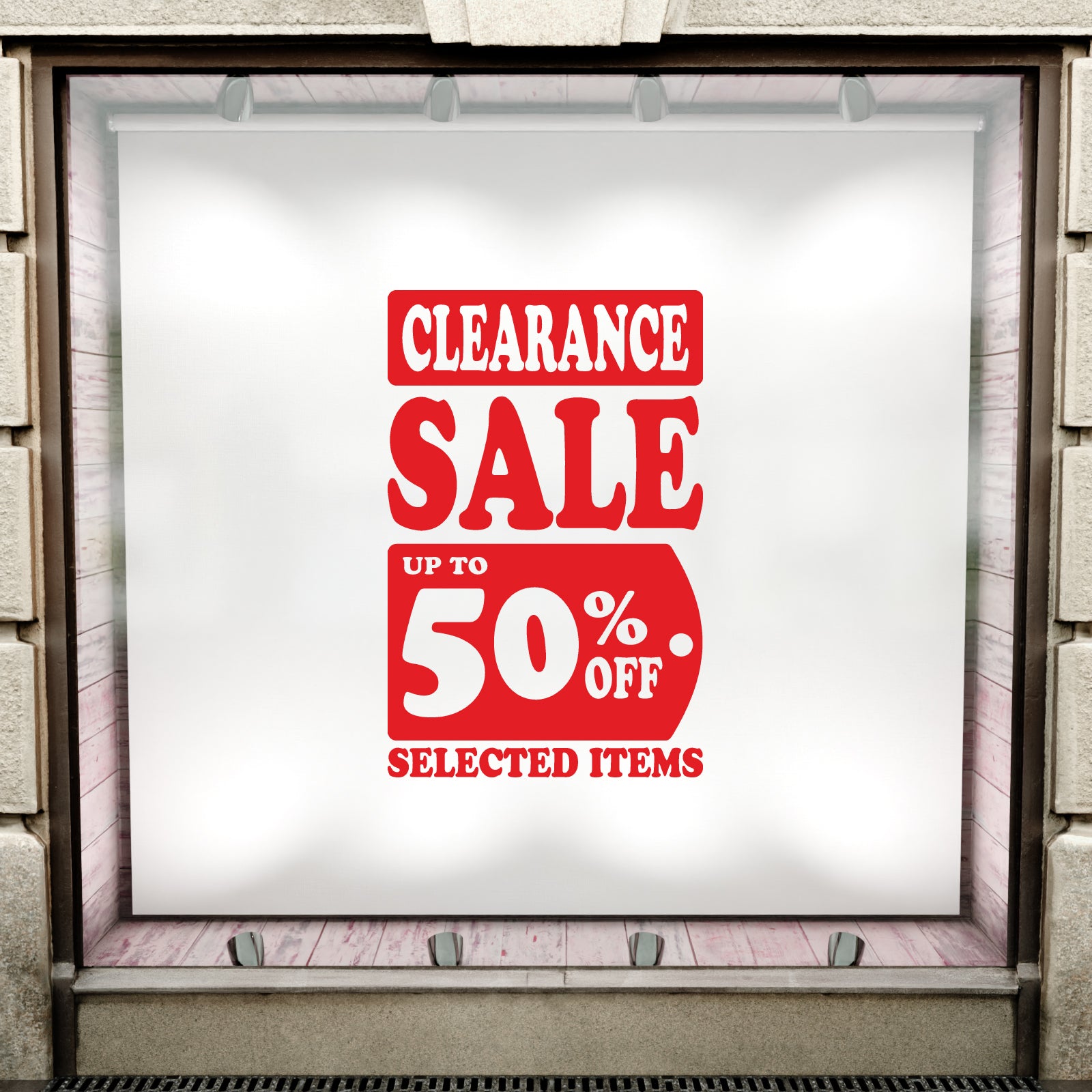 Promote your sale and clear your old stock with this eye-catching 'Clearance Sale Up To XX% Off Selected Items' window or wall sticker.