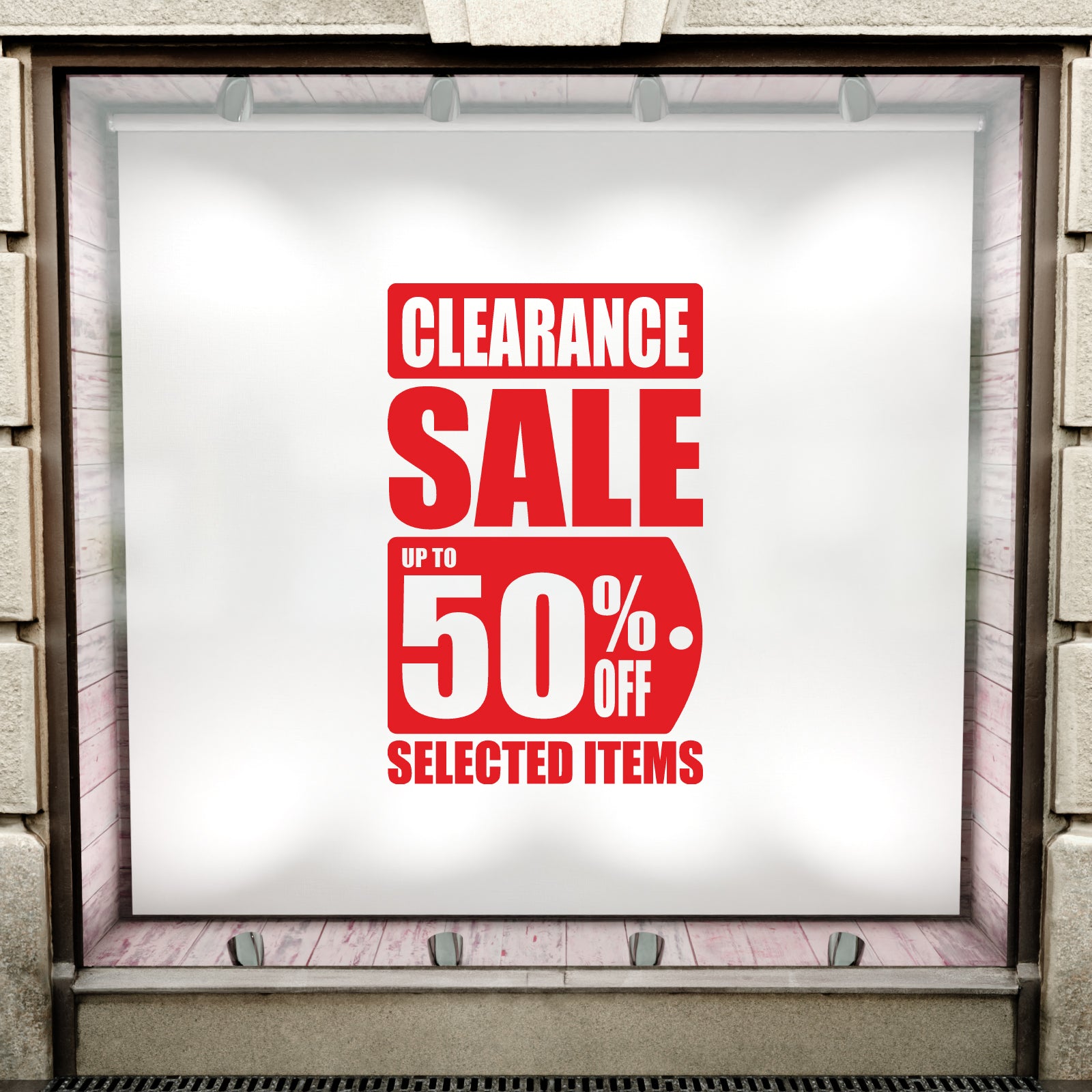 Promote your sale and clear your old stock with this eye-catching 'Clearance Sale Up To XX% Off Selected Items' window or wall sticker.