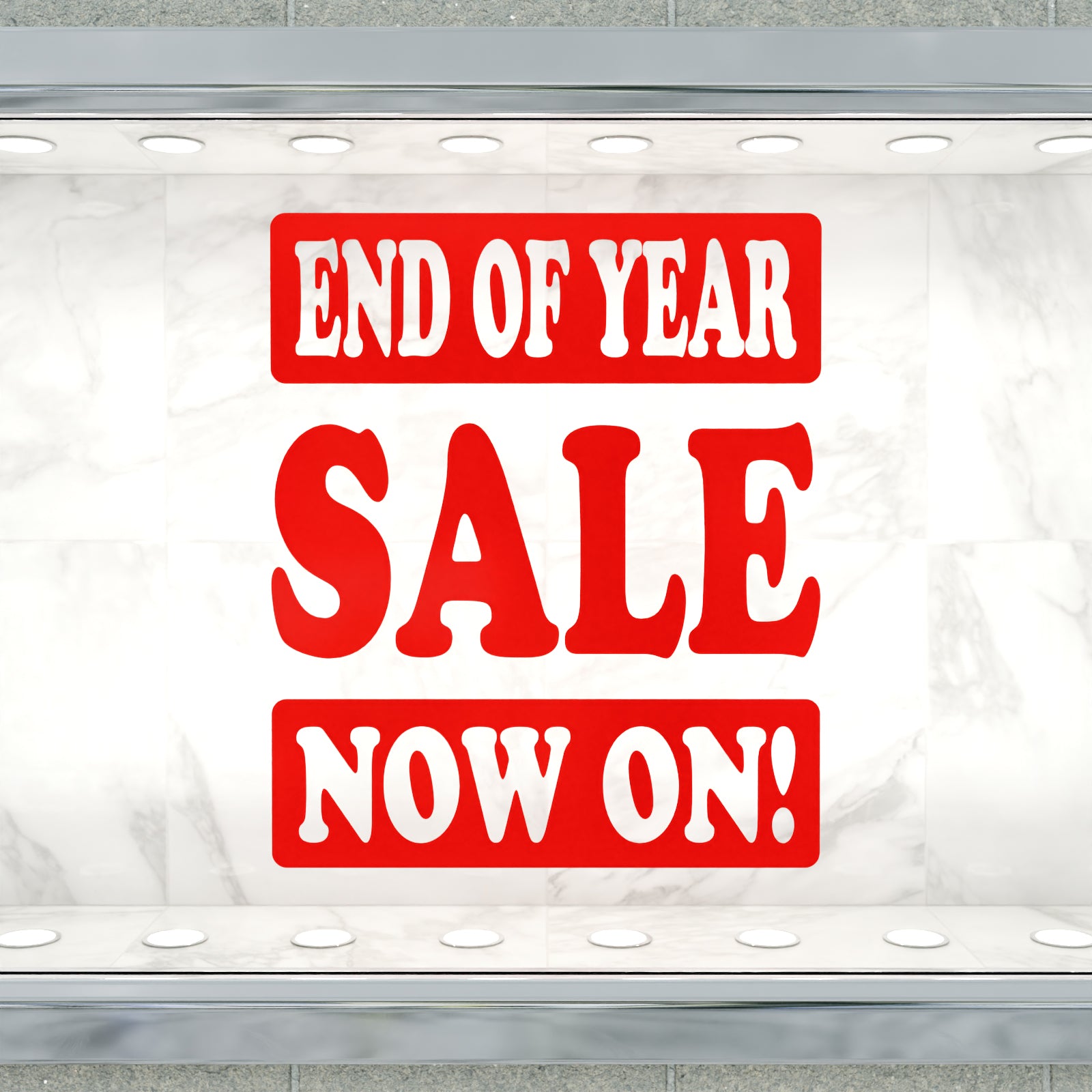 Get ready for the new year with this eye-catching 'End Of Year Sale Now On!' window or wall sticker.
